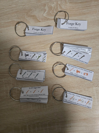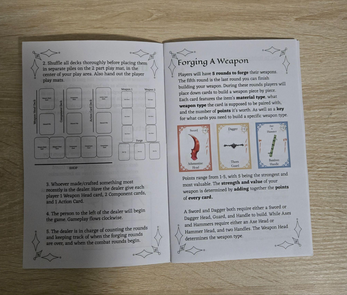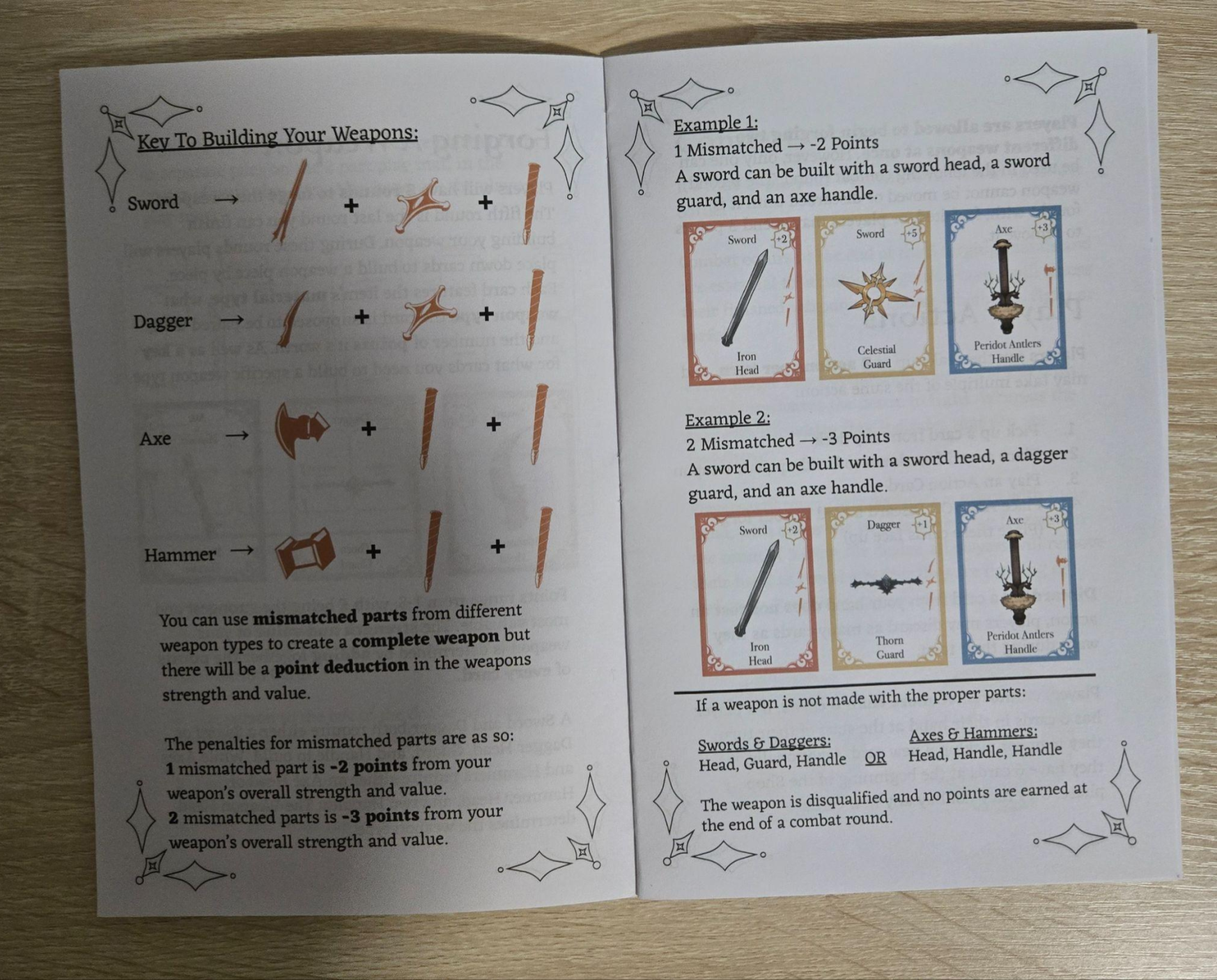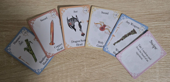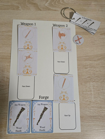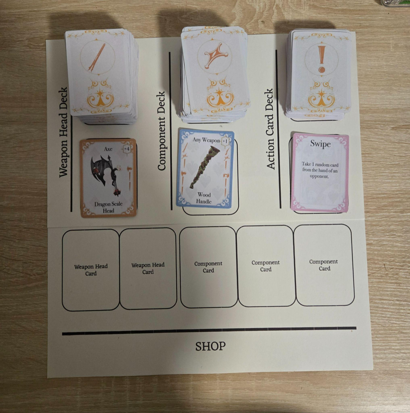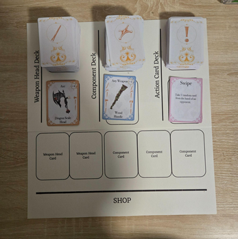 Smithy Battle is a competitive card game where players build up their weapons to prove they are the best blacksmith in town! But how can they prove that they're the best? By fighting of course! Slot together unique weapon parts to forge your way to victory, when you face off against your fellow blacksmiths in battle! Utilize different forge combinations to give yourself a helpful buff, or give enemies an annoying debuff. Shop for better weapon parts to help improve your standing as a blacksmith, and use action cards to sabotage your opponents.